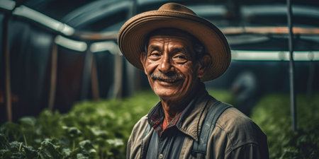 Happy Latin farmer working inside agricultural greenhouse - Farm people lifestyle concept, Generative Ai