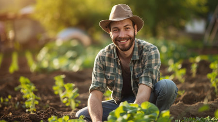 A man farmer, wearing a hat, working in a field, with small plants emerging from the soil, during sunset