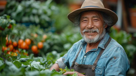 Happy retired elderly man enjoying gardening in his lush vegetable garden, smiling and appreciating life outdoors.