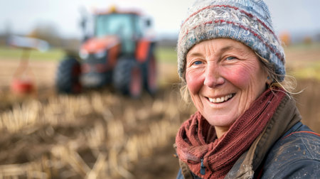 Portrait of smiling mature woman farmer standing in front of tractor in field