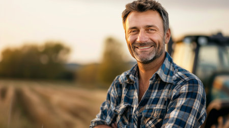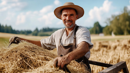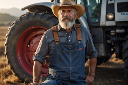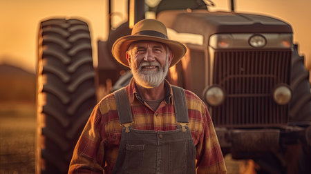 A cheerful farmer wearing denim overalls and a straw hat stands confidently beside his tractor in a sunlit field. This image captures the essence of rural life and the hard work of agriculture