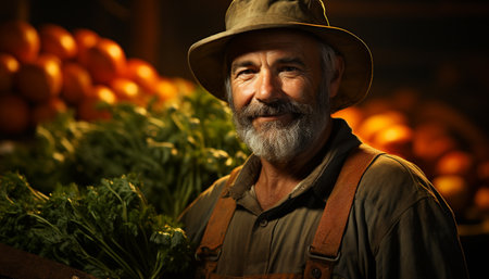 A smiling farmer, outdoors in nature, harvesting fresh vegetables generated by artificial intelligence