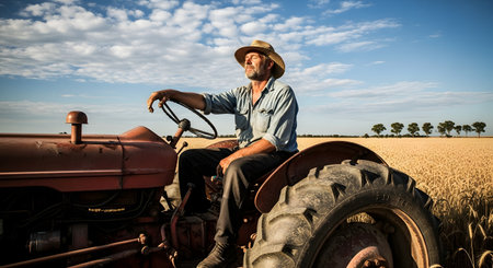 A mature farmer sits on a vintage red tractor in a vast wheat field, closing his eyes to enjoy the sunlight. The golden landscape and blue sky create a peaceful scene of rural life during harvest.