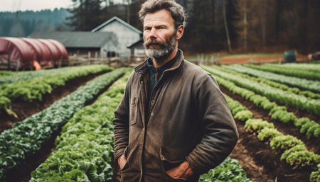 An experienced farmer stands confidently amidst his thriving vegetable garden, with green leaves surrounding him. His worn attire and thoughtful expression reflect years of hard work and commitment to the land.