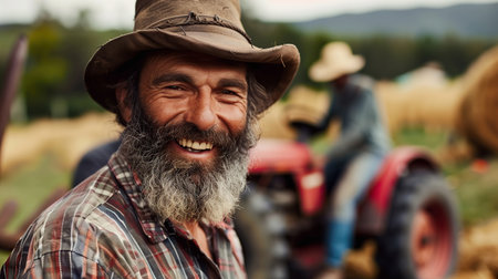 Portrait of a bearded joyful farmer, near other farmers near his tractor