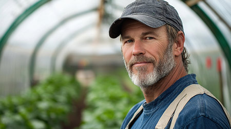 Experienced farmer works in a greenhouse nurturing plants during a sunny day in autumn