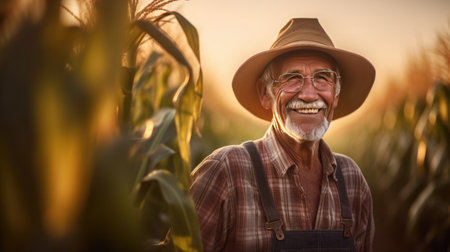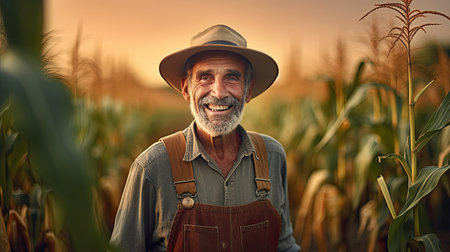 Agriculturist, Portrait of Happy senior farmer in growing corn field. agriculture. Generative Ai