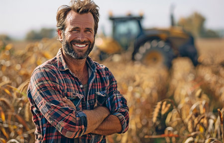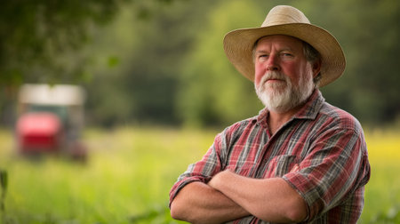 Farmer in a field, medium shot, arms crossed, plaid shirt and sun hat, crops and farm equipment blurred. generative ai