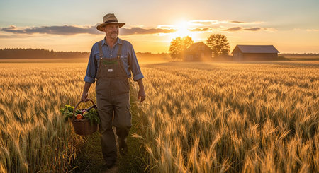Farmer with basket of fresh harvested vegetables standing in wheat field at sunset
