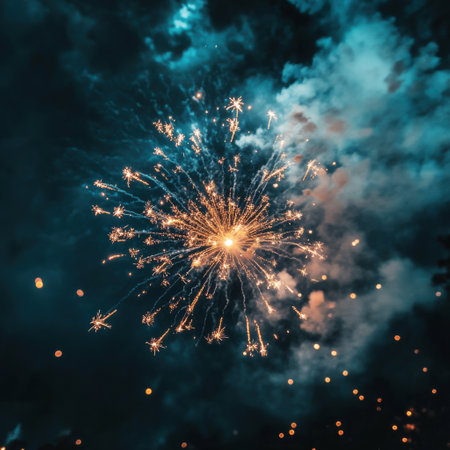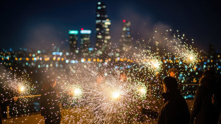 A nighttime scene features a fireworks display, with sparks and bursts illuminating the frame. Silhouetted figures are present, possibly enjoying the celebration. The background showcases a blurred city skyline, with illuminated buildings. The image could be used for festive, celebratory, or event-related commercial purposes.