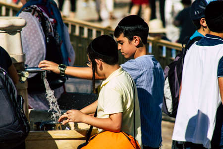 Jerusalem Israel June 19, 2019 View of young Israeli kid walking front the Western wall in the Old city of Jerusalem in the afternoon