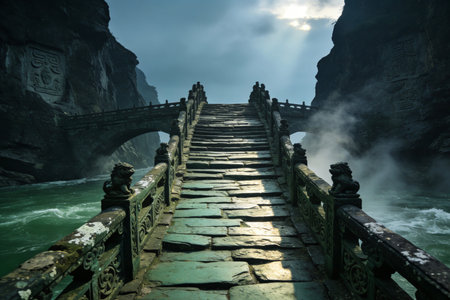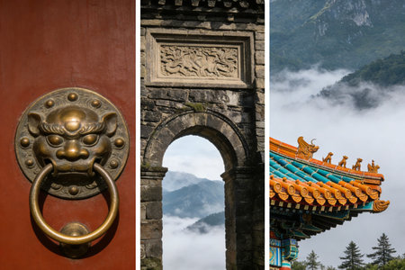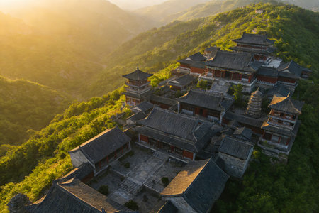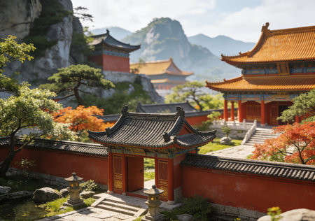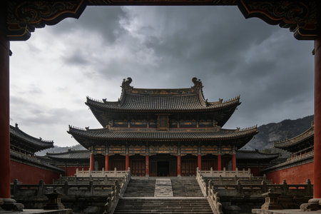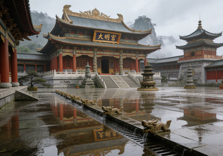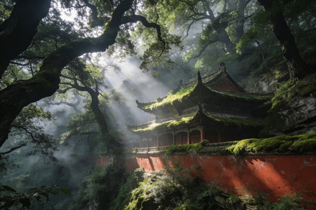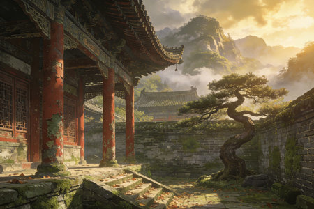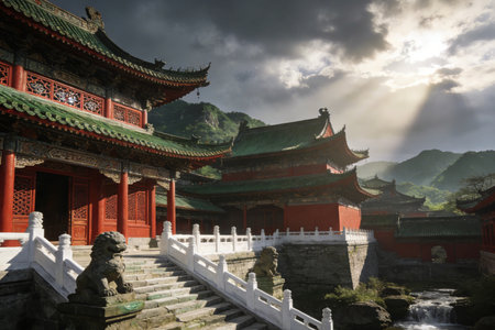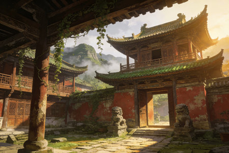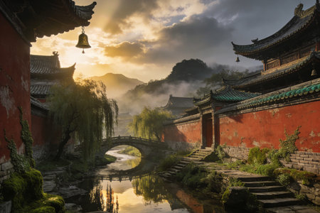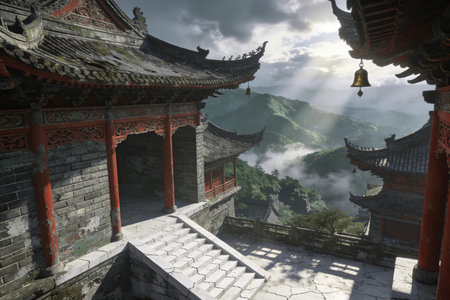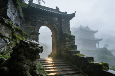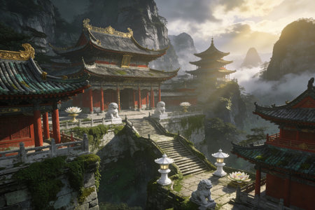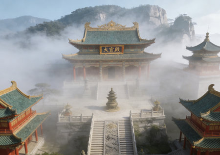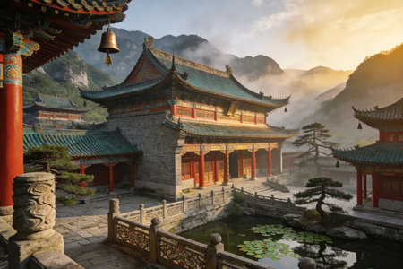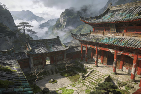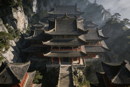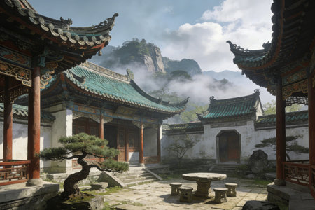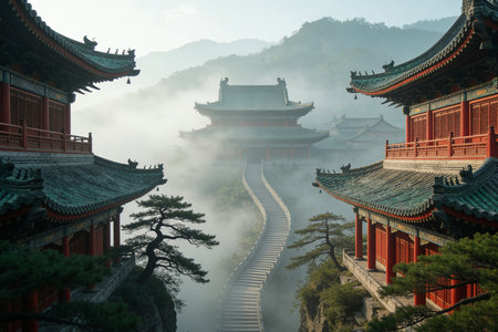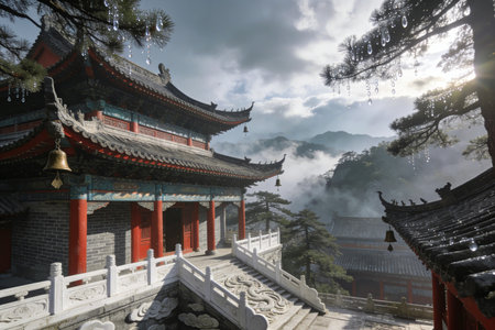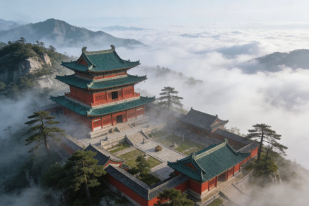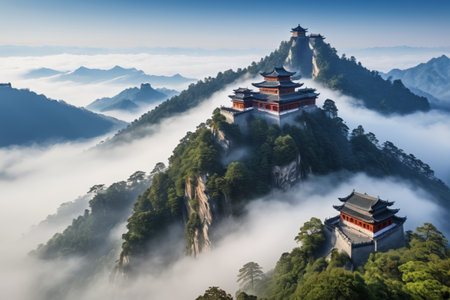 majestic china pagoda rising above misty mountain range, created with generative ai