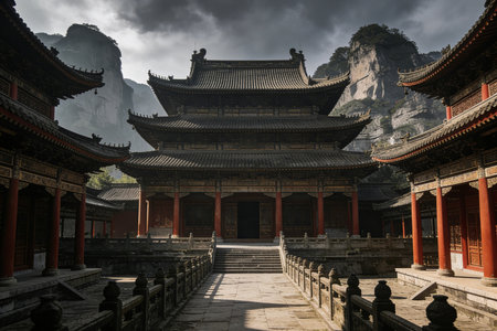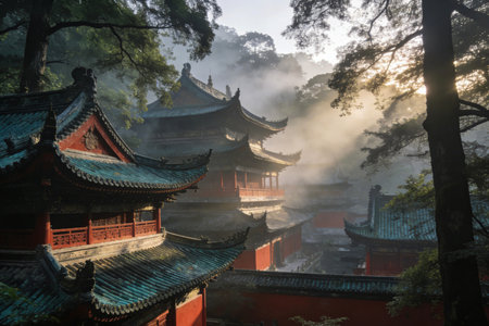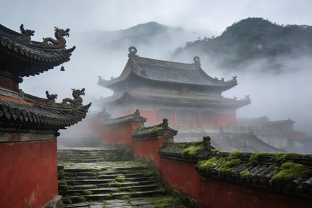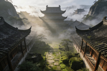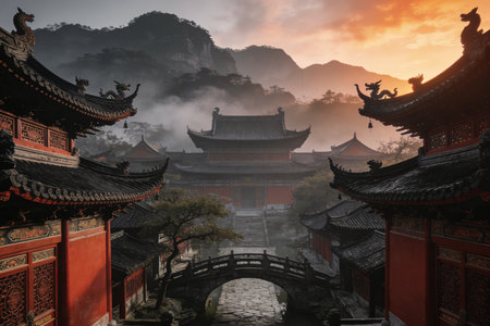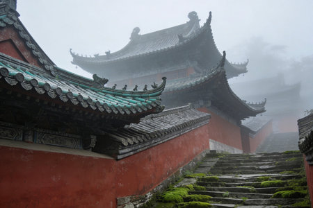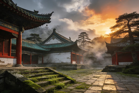 Ancient Chinese architecture in a foggy morning at Xian, China