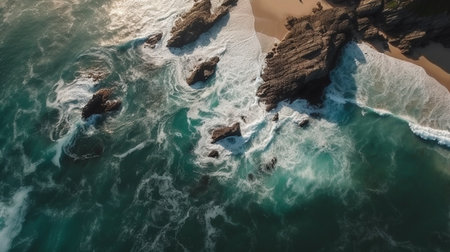 AI Generated. Aerial view of the ocean meeting the rocky coastline