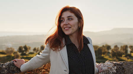 Beautiful girl with white dress explores an ancient Italian castle at sunset