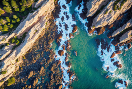 An aerial view presents waves crashing against a rugged, rocky shoreline. The image features shades of blue and turquoise water. The scene shows the interaction of water and stone, suggesting a coastal environment. Suitable for various commercial and editorial applications.