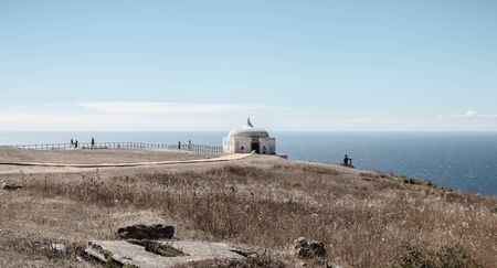 Cape Espichel near Sesimbra, Portugal - August 8, 2018: Architectural detail of the Cape Espichel sanctuary on a summer day. The Baroque church is built between 1701 and 1707 in memory of the Holy Mary in 1410