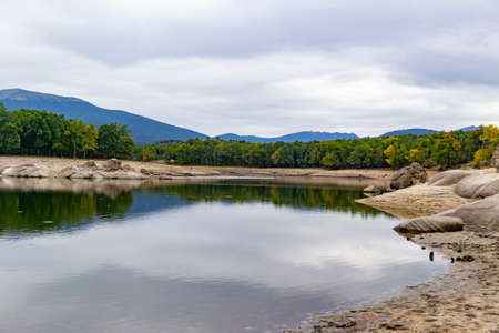 Views of a reservoir that reflects the landscape in the water on a cloudy day in Segovia, in Castilla y León, in Spain. Europe. Horizontal photography.