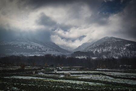 Snow clouds over a village in the snowy mountains of the Sierra Nevada of Spain. Beautiful Winter View Over a Snowy Mountain