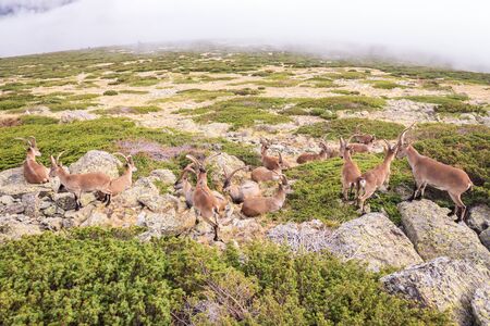 Group of wild goats, ibex pyrenaica, resting on some rocks in a mountain.