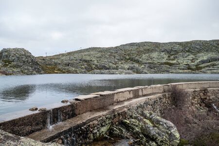 Blue fresh water at dam lake on hilly landscape covered by rocks and brushwood, on the highlands at the Serra da Estrela. The highest mountain range in continental Portugal, with astonishing scenery.