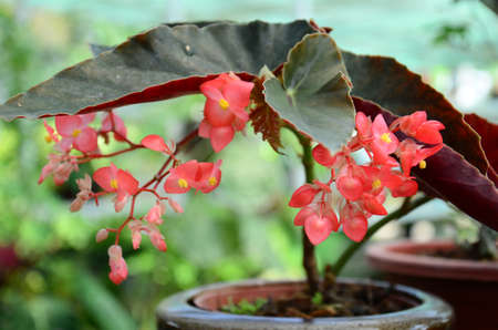 Close up of delicate small red begonia flowers with fresh green leaves in a pot in a garden in a sunny summer day, perennial flowering plants in the family Begoniaceae, vivid floral background