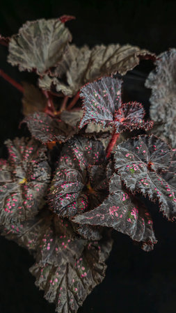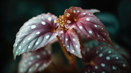 Discover the exquisite detail of a begonia plant showcasing vibrant leaves with striking white dots, perfect for botanical illustrations and serene home decor.
