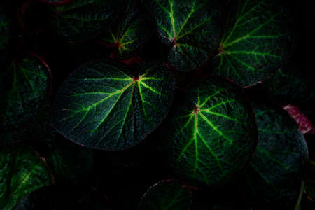 Green round leaf texture on dark background. Close-up detail of begonia leaves. House plant. Indoor plants. Begonia leaf for home decoration. Wallpaper for spa or mental health and mind therapy.