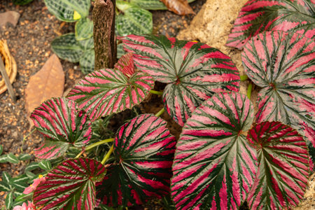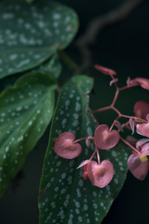Beautiful close-up of colorful begonia leaves featuring vibrant red dots and pink flowers, creating a striking natural design perfect for botanical art and decoration.