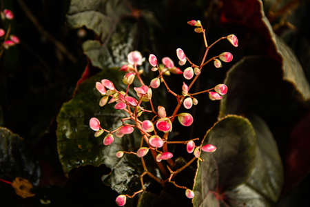 Decorative indoor plants begonias. Interior decoration of the room. Large colored leaves. Dark background