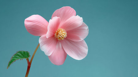 Pink begonia plant with delicate flowers blooming in a stylish blue ceramic pot, adding a touch of elegance to a teal backdrop