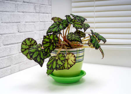 Begonia Cleopatra close-up leaf on the windowsill in bright sunlight with shadows. Potted house plants, green home decor, care and cultivation