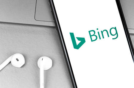 Bing app logo on the screen smartphone with headphones Earpods closeup. Bing is a web search engine owned and operated by Microsoft. Moscow, Russia - August 11, 2020