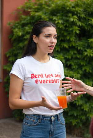 Joyful East Asian woman confidently leading a discussion or presentation in front of a colorful wall, engaging participants in an informal event.