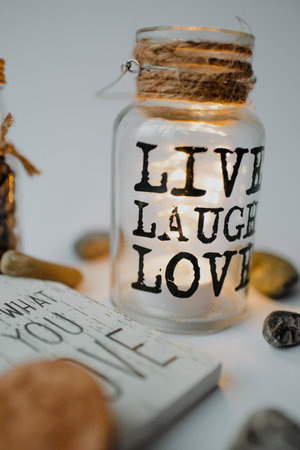 A vertical shot of a jar with the text live laugh love in a decoration set