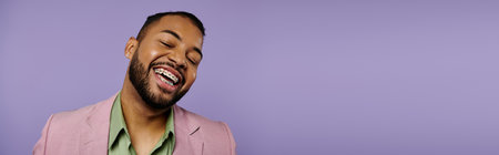 Young African American man with braces laughing joyfully in a stylish pink jacket against a vibrant purple backdrop.