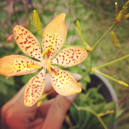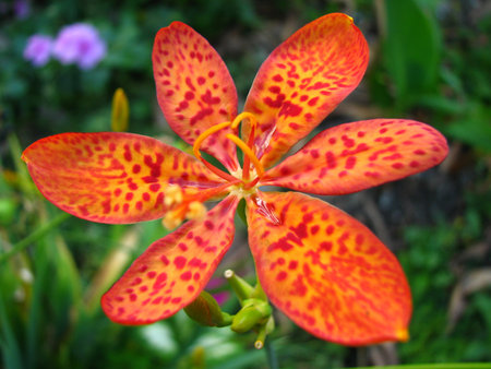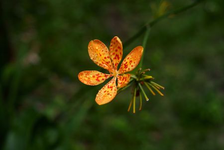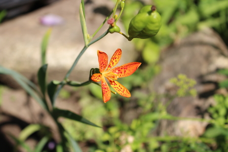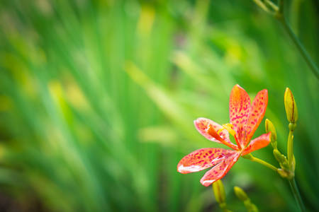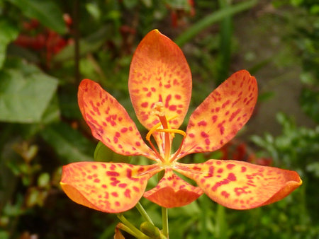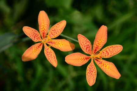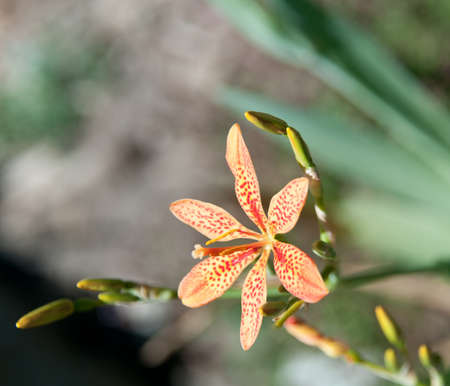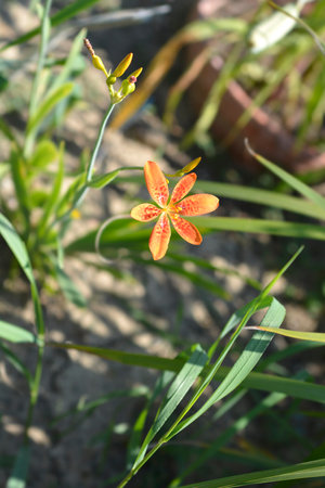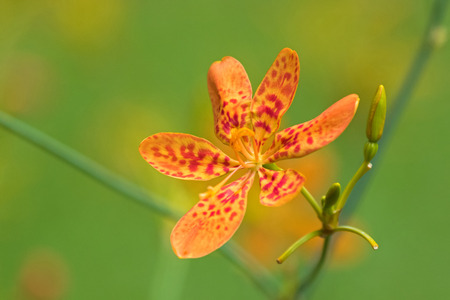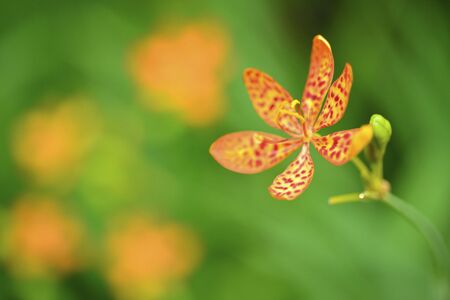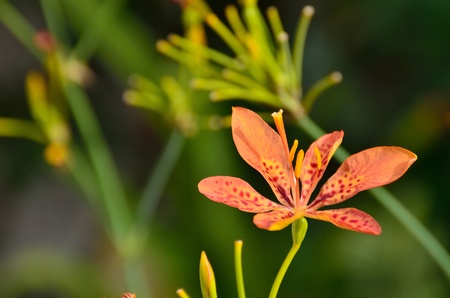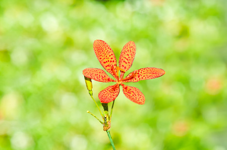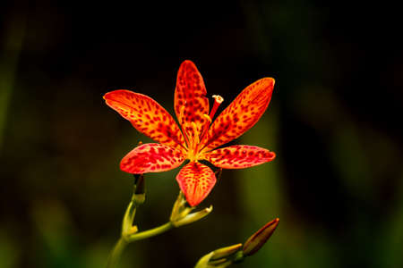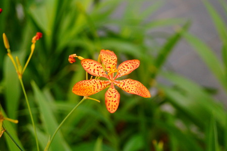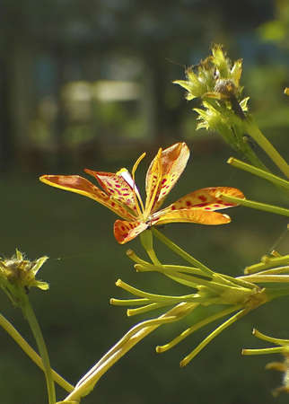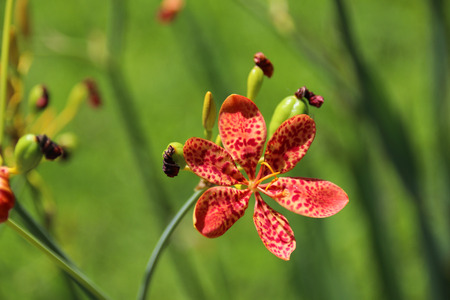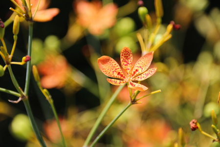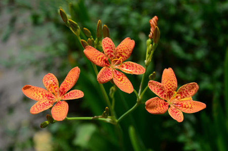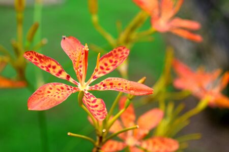 Closeup photo of Blackberry lily, leopard flower, leopard lily (Iris domestica) in the garden in Singapore, blurred background
