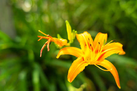 Vivid orange lily martagon on green background outdoors in summer, copy space
