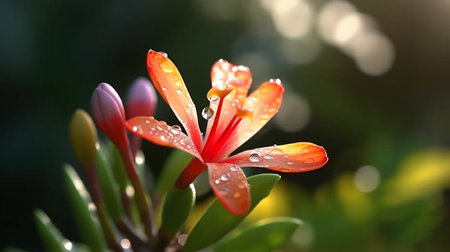 AI Generated. A red flower with dewdrops on its petals and a blurred backdrop