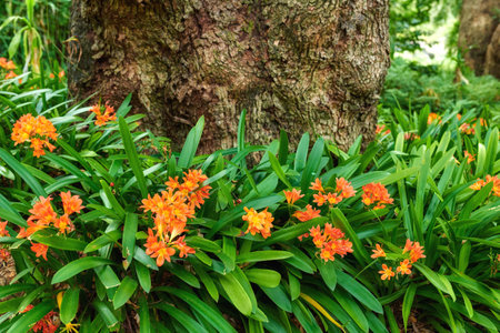 Orange bush lilies growing near a tree trunk in spring. Nature landscape of indigenous clivia lily flowers blooming in green nature. Popular native South African plant in a lush garden foliage