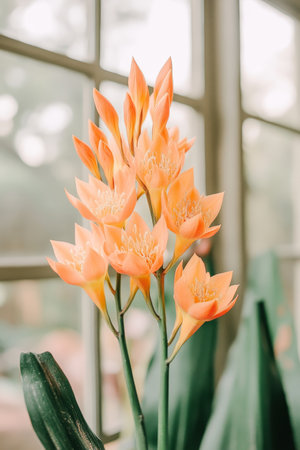 Enchanting orange alstroemeria flowers blooming in a misty, dreamlike garden