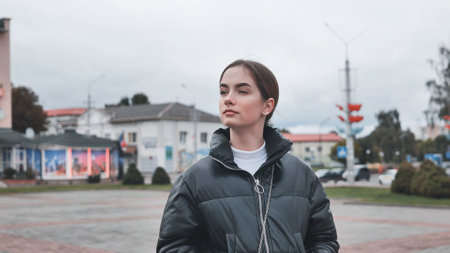 Stylish young woman wearing black puffy jacket and white turtleneck enjoys a cloudy day in a town square