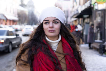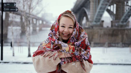 A young girl in a beautiful bright headscarf poses at the camera against the background of a snow-covered city embankment.