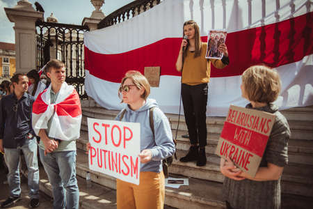 Lisbon, Portugal - March 19, 2022: a Belorussian manifestation in support of Ukraine, against invasion and aggressive war: selective focus on a female activist speaking into a microphone in background