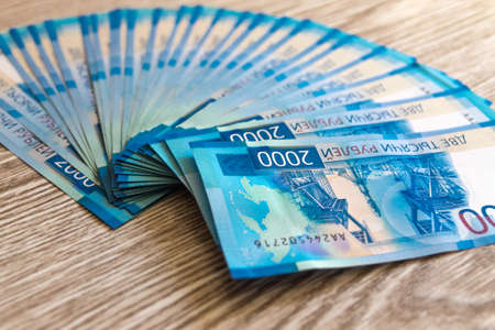 Background from Russian money, frame from many banknotes rubles, denomination 2000, copy space. Concept cash, salary, loan, wealth, credit, finance, business, deposit, insurance. Top view, flat lay.