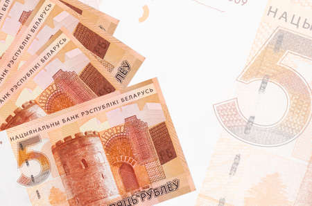5 Belorussian rubles bills lies in stack on background of big semi-transparent banknote. Abstract business background with copy space