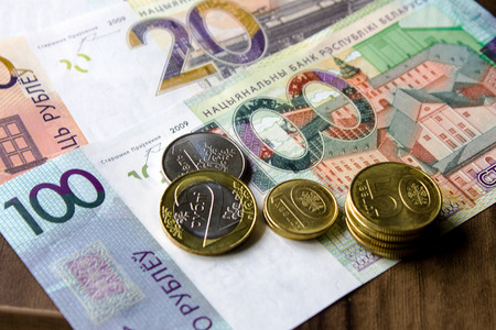 Belarusian paper money in hands on wooden background. Many currency banknotes of different denominations