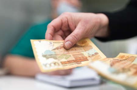 Money, Ukrainian hryvnia bills in hand on pink paper background with copy space.