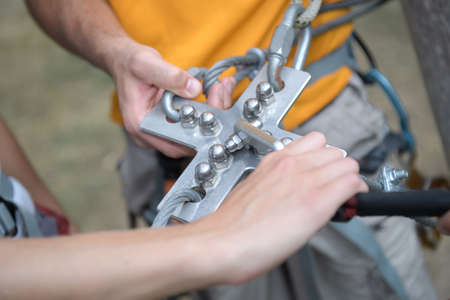 Rope park. The hand hooks the carabiners to the belay line. Close-up