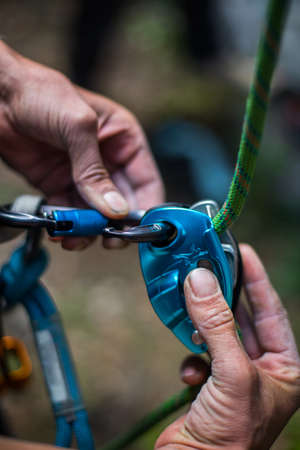 Unrecognizable climber man in safety harness attaches a figure of eight device to carabiner, close-up.